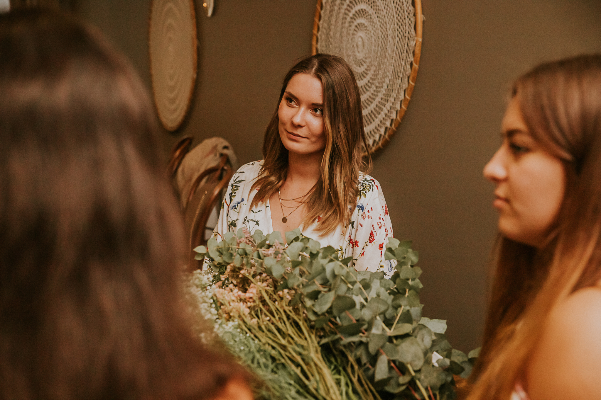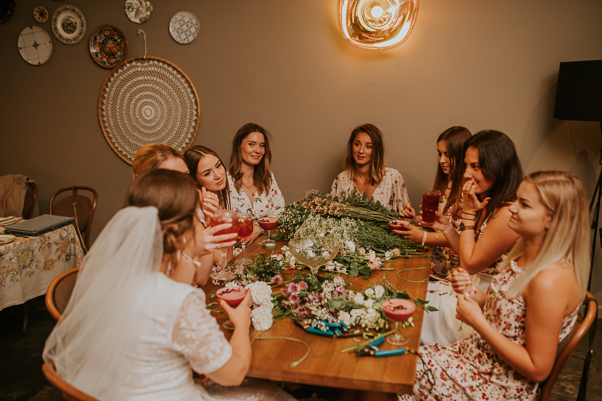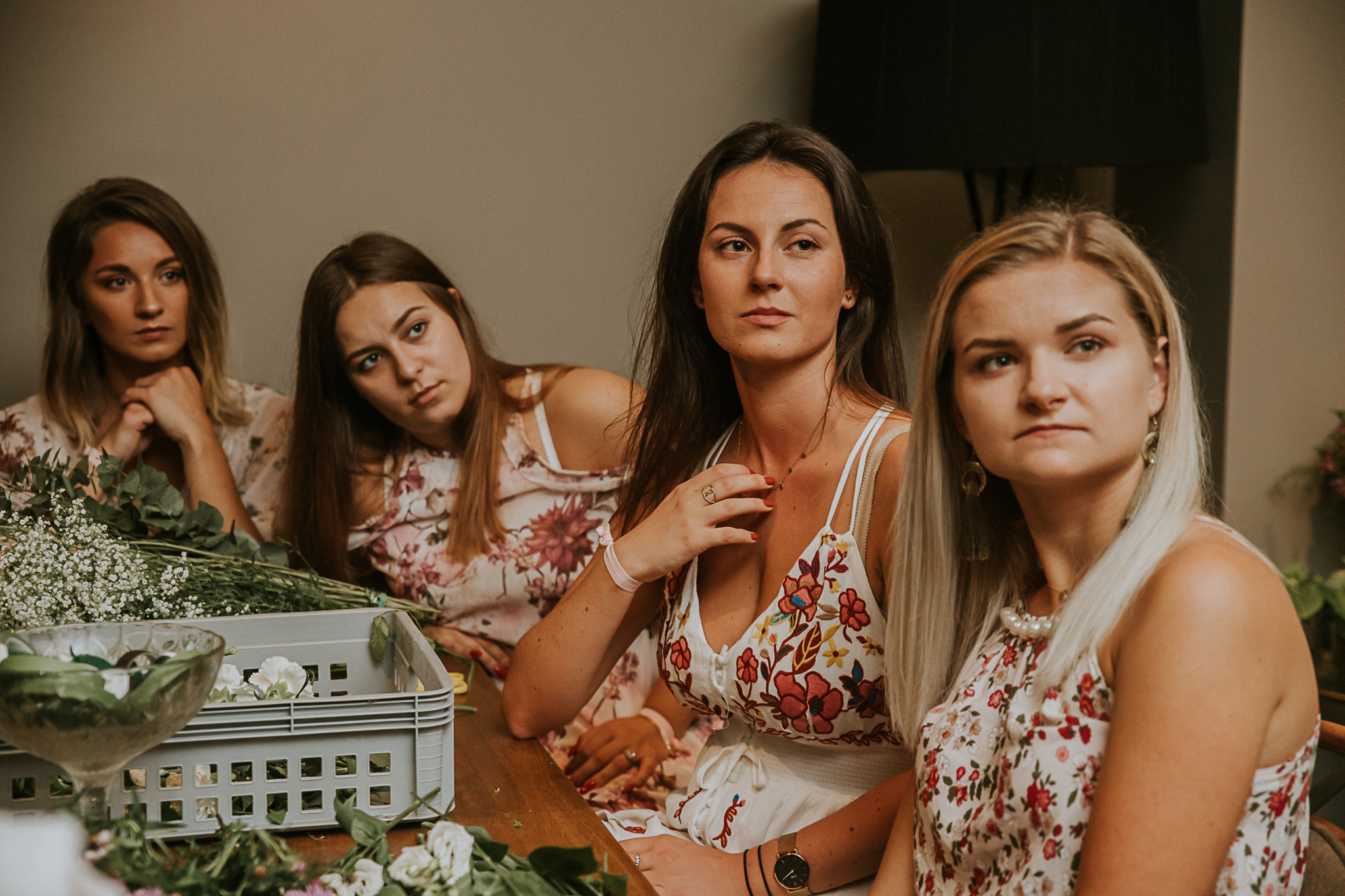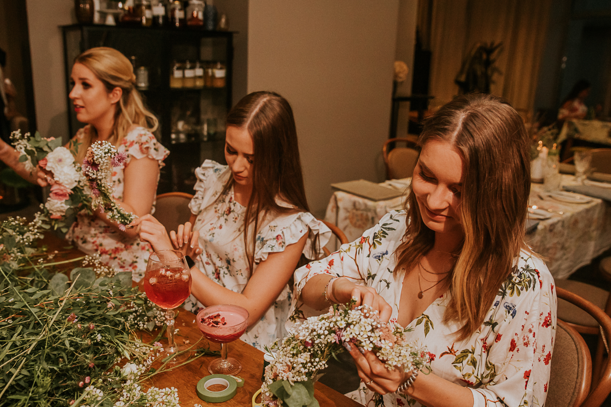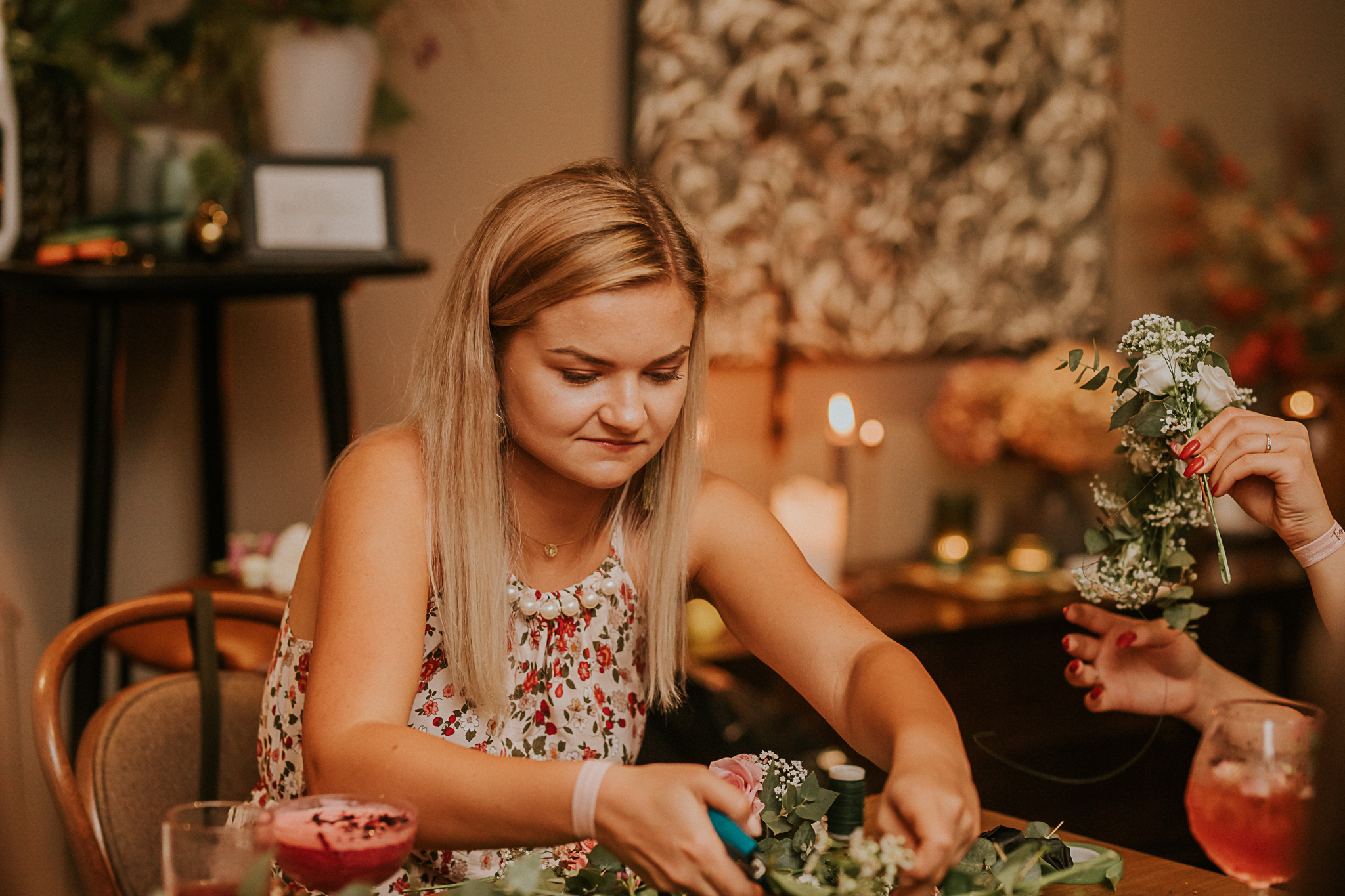 Trendem podczas wieczorów panieńskich czy urodzin stają się teraz kreatywne spotkania ze znajomymi. Podczas takich spotkań nie tylko pije się kawę i zajada się ciastem. Na takie spotkania zaprasza się osobę, która robi ciekawe rzeczy. Dlatego, podczas wieczoru panieńskiego Ani, na który zabiorę Was pod postem, dziewczyny uczyły się jak pleść wianki. Na pozór spotkanie nie różniło się od tych zwyczajnych, przy stole. Wieczór odbył się w restauracji, były drinki, ciasto i dobre jedzenie. Pani Kwiat-kowska uczyła dziewczyny jak zrobić przepiękny boho wianek na głowę. Ja w tym czasie fotografowałam dziewczyny. Fotografowanie grupy osób, to nie lada wyzwanie. Zawsze znajdzie się ktoś, kto właśnie zamknie oczy. Pewien naukowiec podaje, że człowiek mruga średnio 10 razy na minutę. W rezultacie zamknięcie oczu trwa około 250 milisekund. Prędkość migawki to 8 milisekund. Dlatego sprzedam Wam rozwiązanie, zanim zrobisz zdjęcie, każ wszystkim zamknąć oczy. Dobre rezultaty, są niemal pewne.