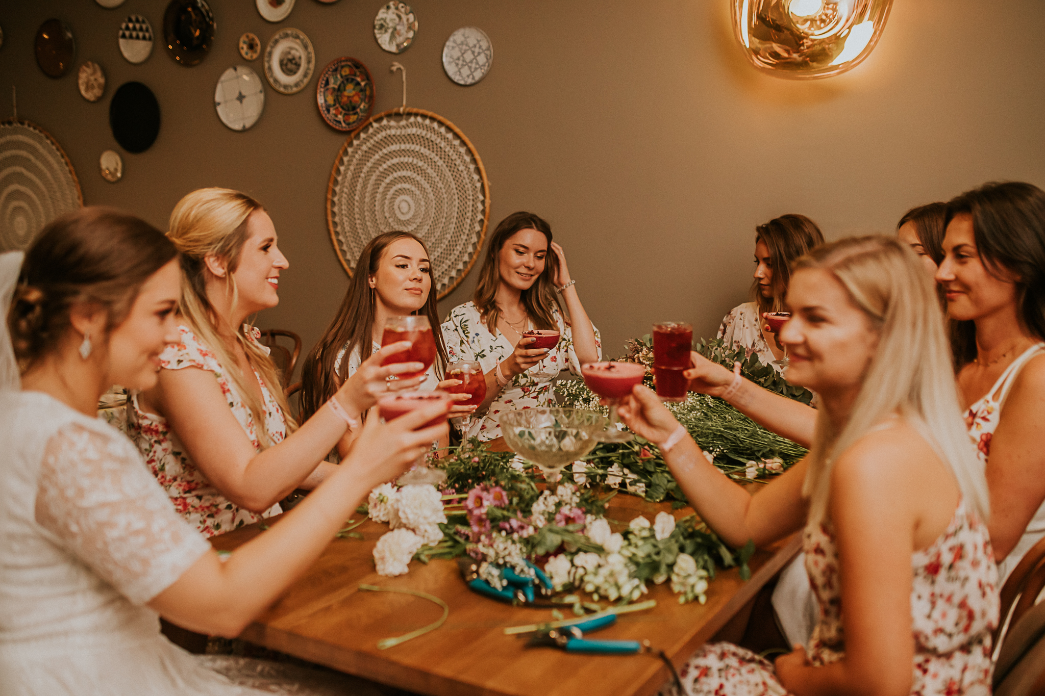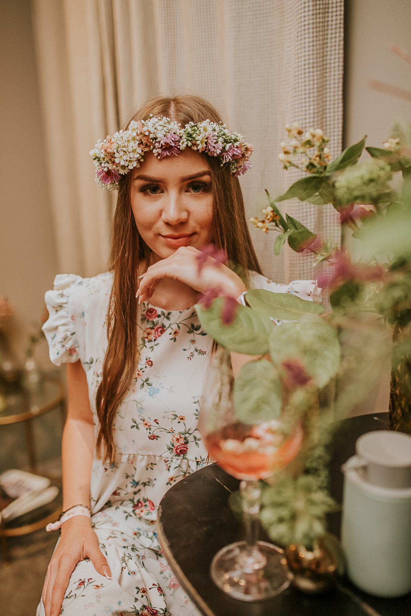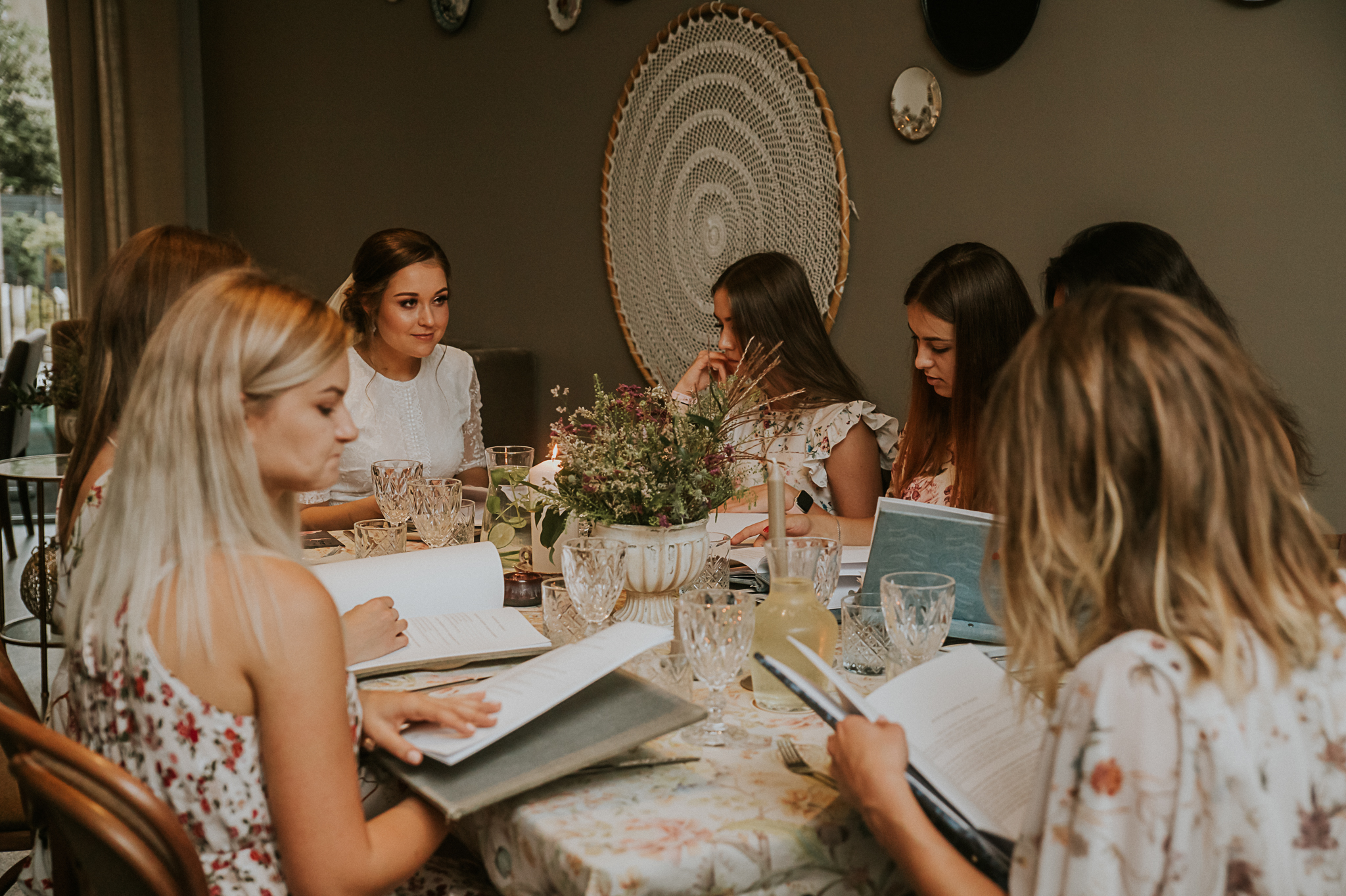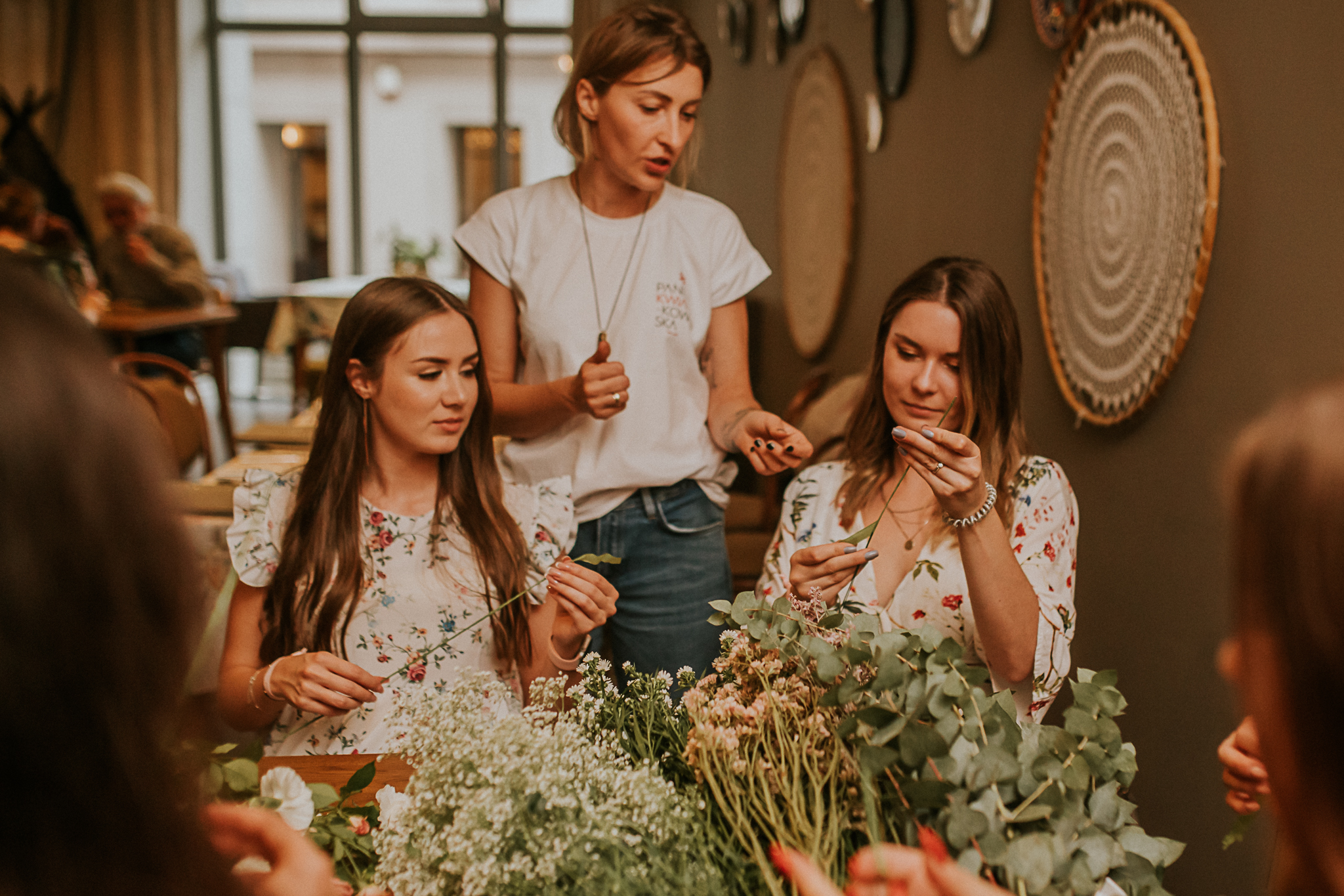 Trendem podczas wieczorów panieńskich czy urodzin stają się teraz kreatywne spotkania ze znajomymi. Podczas takich spotkań nie tylko pije się kawę i zajada się ciastem. Na takie spotkania zaprasza się osobę, która robi ciekawe rzeczy. Dlatego, podczas wieczoru panieńskiego Ani, na który zabiorę Was pod postem, dziewczyny uczyły się jak pleść wianki. Na pozór spotkanie nie różniło się od tych zwyczajnych, przy stole. Wieczór odbył się w restauracji, były drinki, ciasto i dobre jedzenie. Pani Kwiat-kowska uczyła dziewczyny jak zrobić przepiękny boho wianek na głowę. Ja w tym czasie fotografowałam dziewczyny. Fotografowanie grupy osób, to nie lada wyzwanie. Zawsze znajdzie się ktoś, kto właśnie zamknie oczy. Pewien naukowiec podaje, że człowiek mruga średnio 10 razy na minutę. W rezultacie zamknięcie oczu trwa około 250 milisekund. Prędkość migawki to 8 milisekund. Dlatego sprzedam Wam rozwiązanie, zanim zrobisz zdjęcie, każ wszystkim zamknąć oczy. Dobre rezultaty, są niemal pewne.