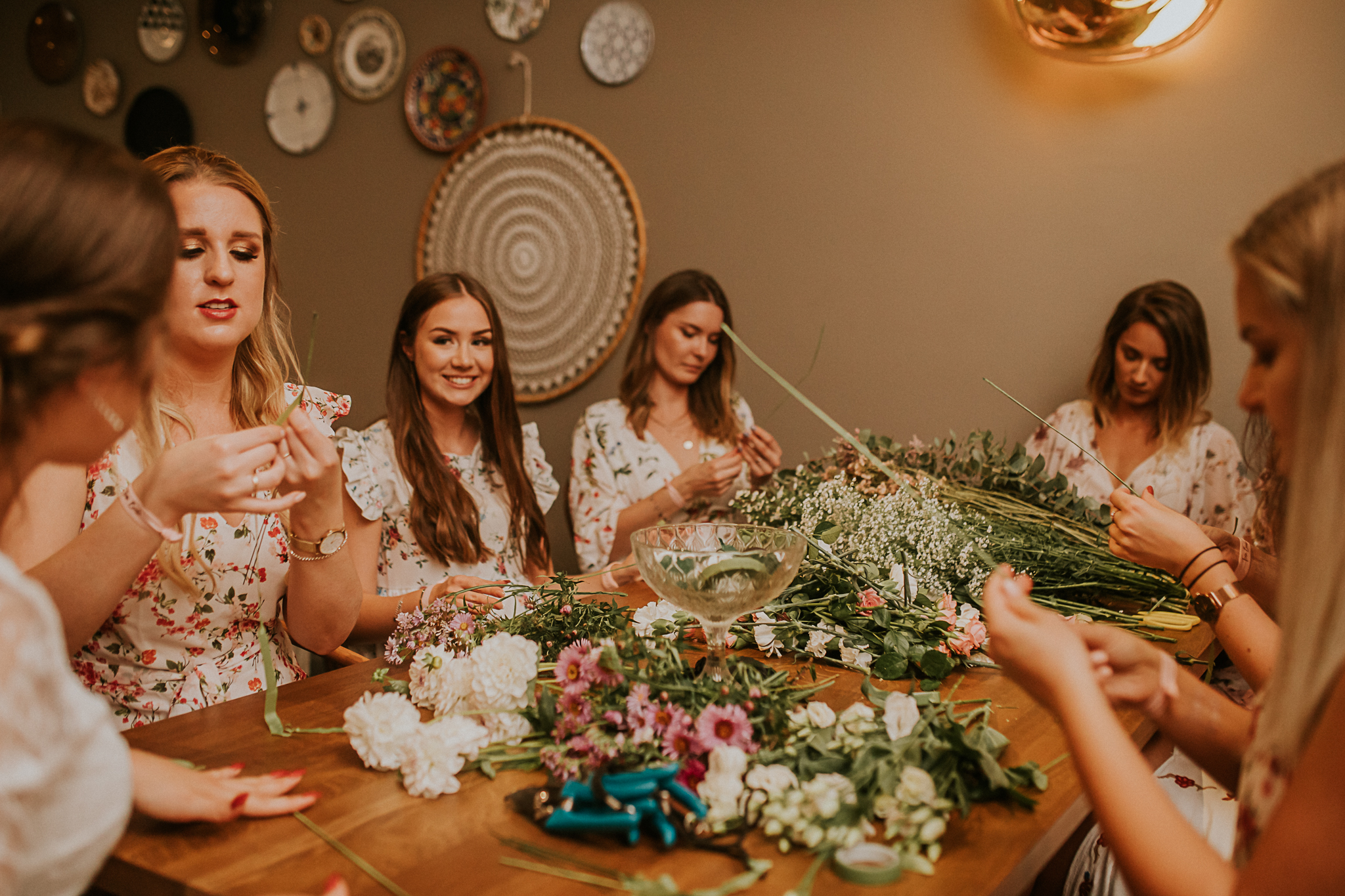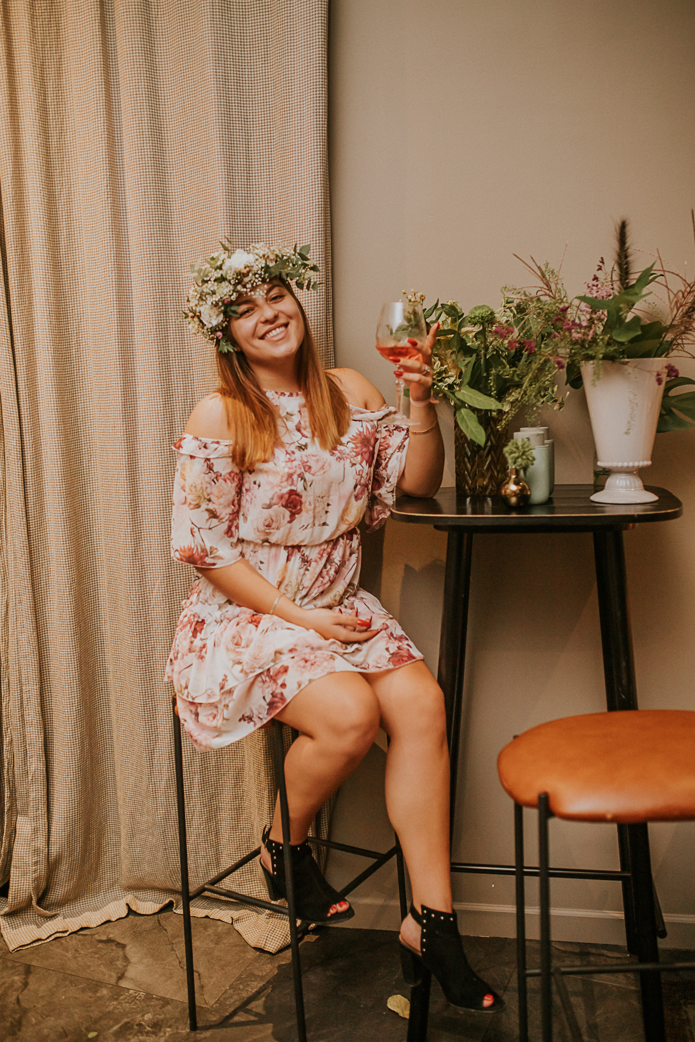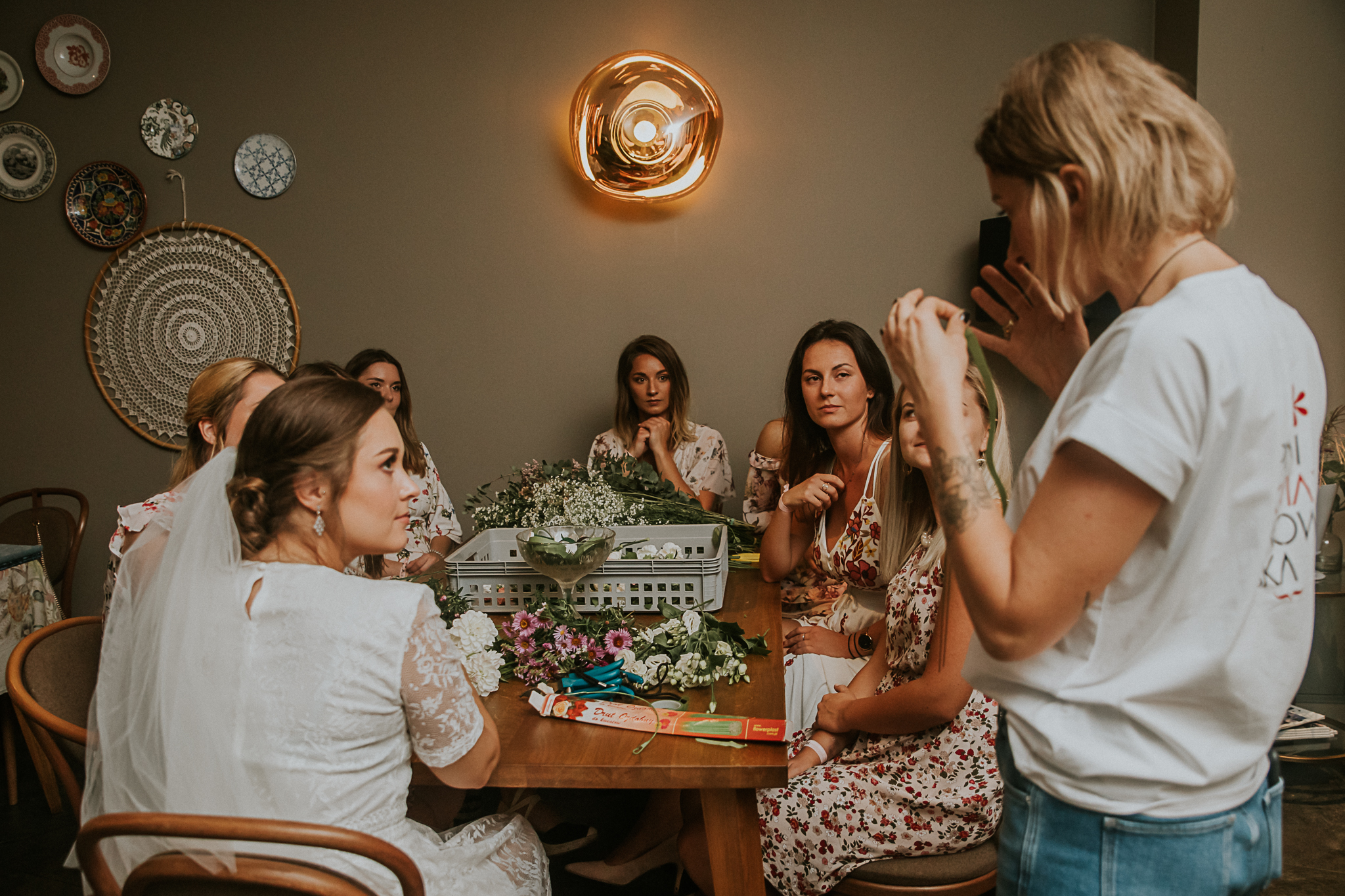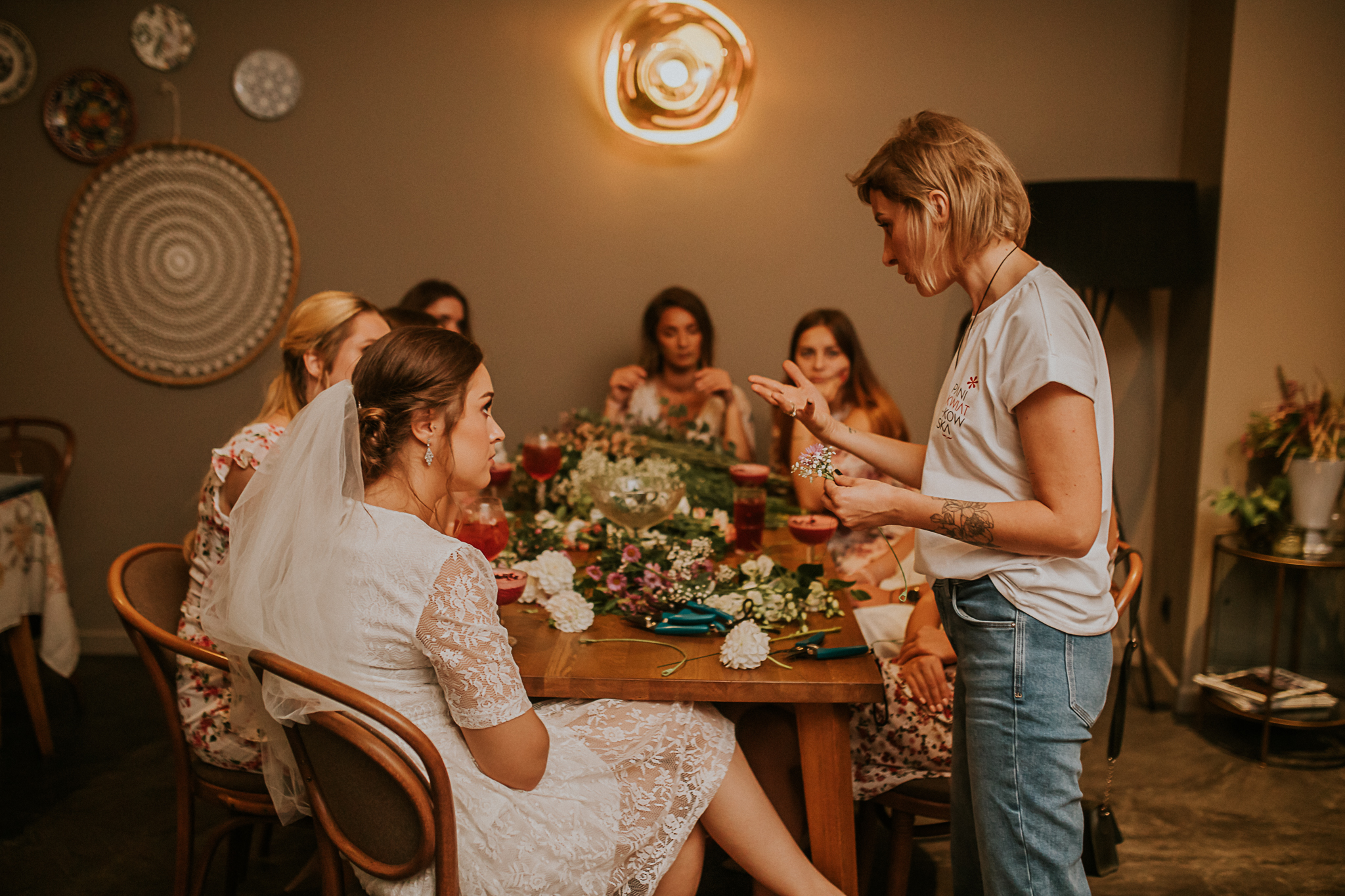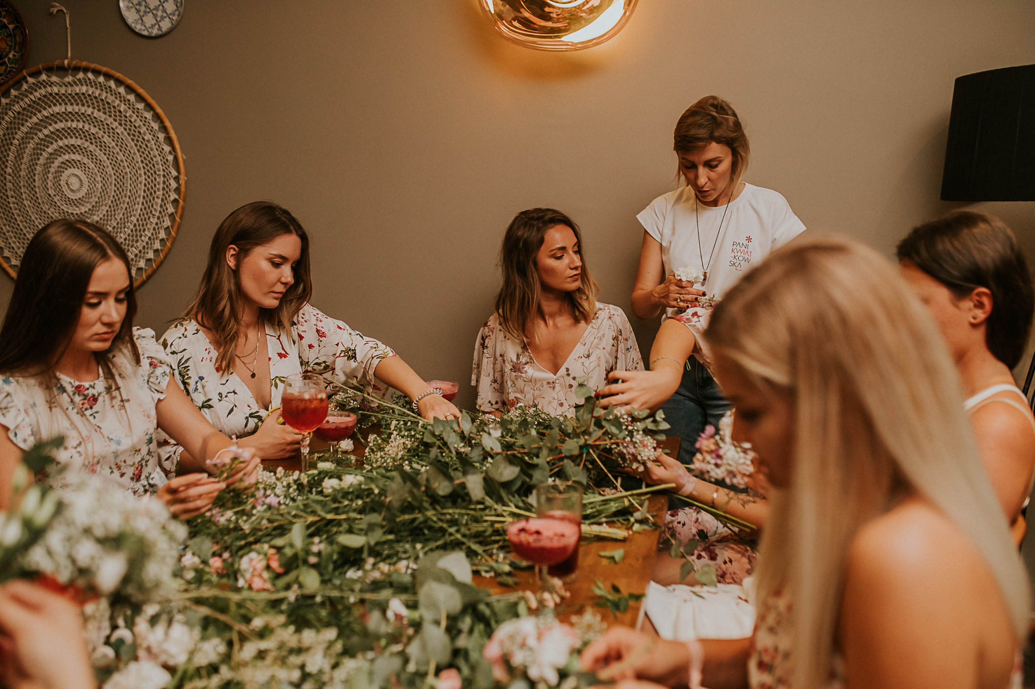 Trendem podczas wieczorów panieńskich czy urodzin stają się teraz kreatywne spotkania ze znajomymi. Podczas takich spotkań nie tylko pije się kawę i zajada się ciastem. Na takie spotkania zaprasza się osobę, która robi ciekawe rzeczy. Dlatego, podczas wieczoru panieńskiego Ani, na który zabiorę Was pod postem, dziewczyny uczyły się jak pleść wianki. Na pozór spotkanie nie różniło się od tych zwyczajnych, przy stole. Wieczór odbył się w restauracji, były drinki, ciasto i dobre jedzenie. Pani Kwiat-kowska uczyła dziewczyny jak zrobić przepiękny boho wianek na głowę. Ja w tym czasie fotografowałam dziewczyny. Fotografowanie grupy osób, to nie lada wyzwanie. Zawsze znajdzie się ktoś, kto właśnie zamknie oczy. Pewien naukowiec podaje, że człowiek mruga średnio 10 razy na minutę. W rezultacie zamknięcie oczu trwa około 250 milisekund. Prędkość migawki to 8 milisekund. Dlatego sprzedam Wam rozwiązanie, zanim zrobisz zdjęcie, każ wszystkim zamknąć oczy. Dobre rezultaty, są niemal pewne.