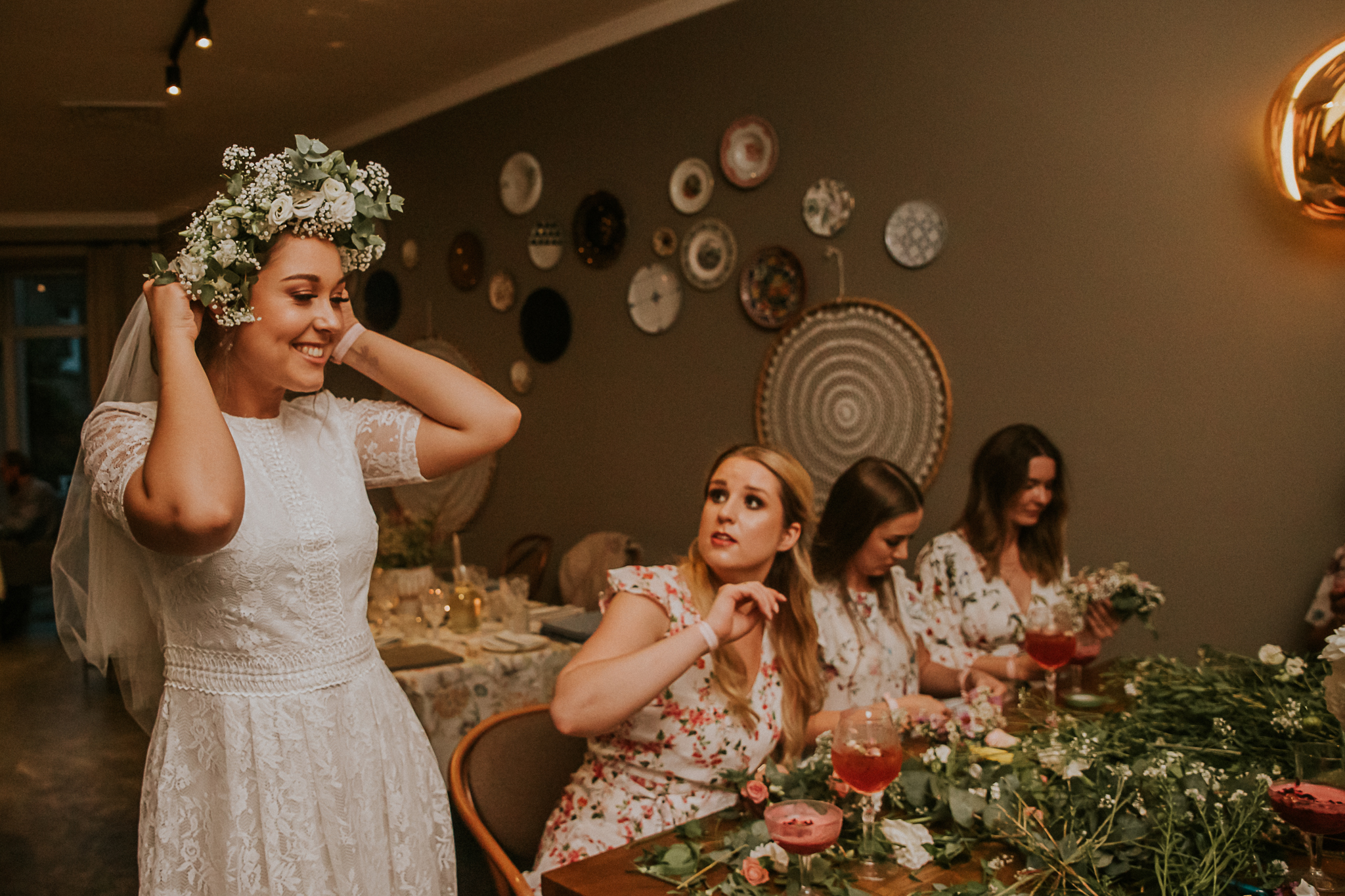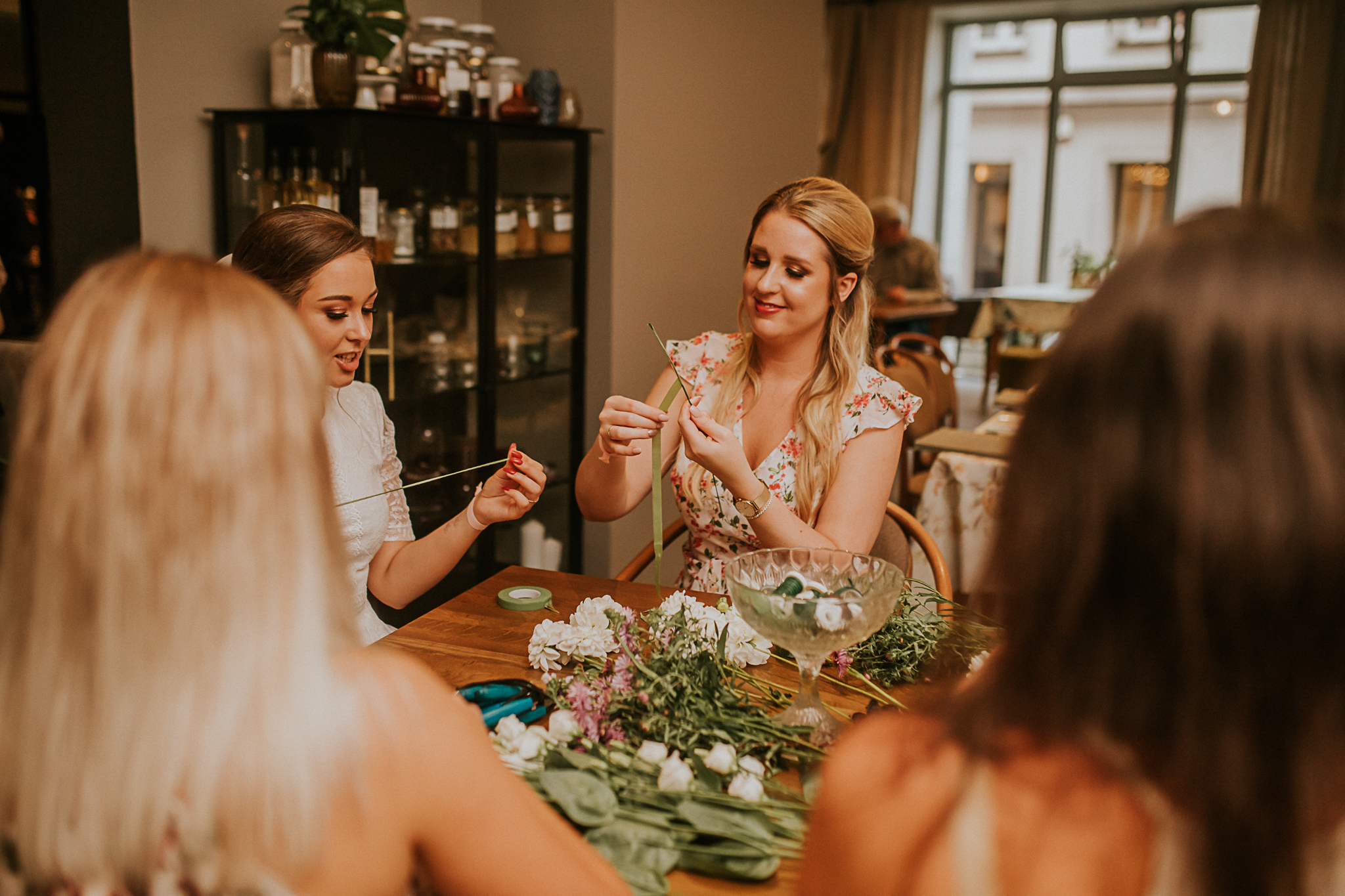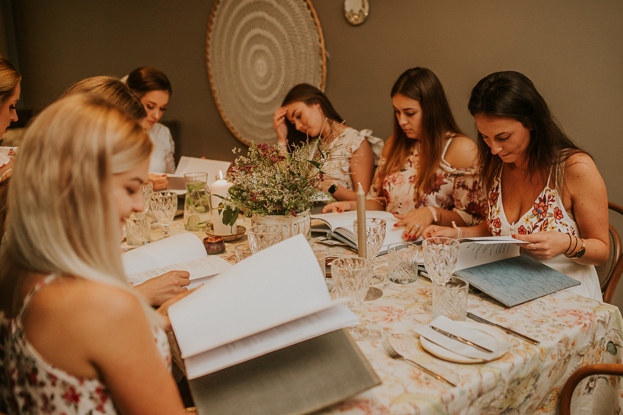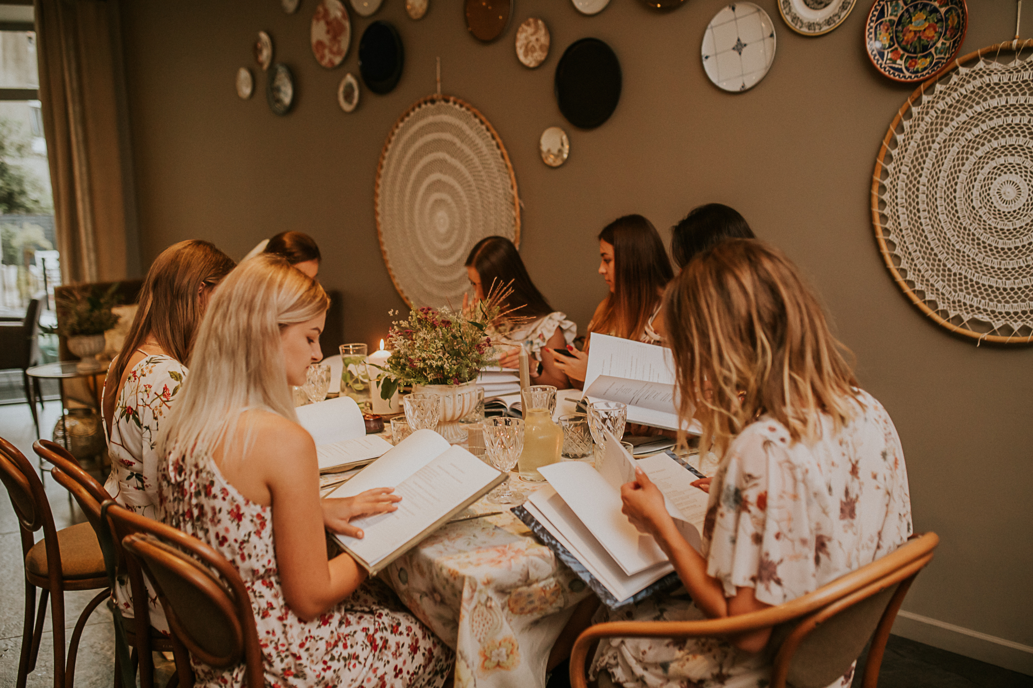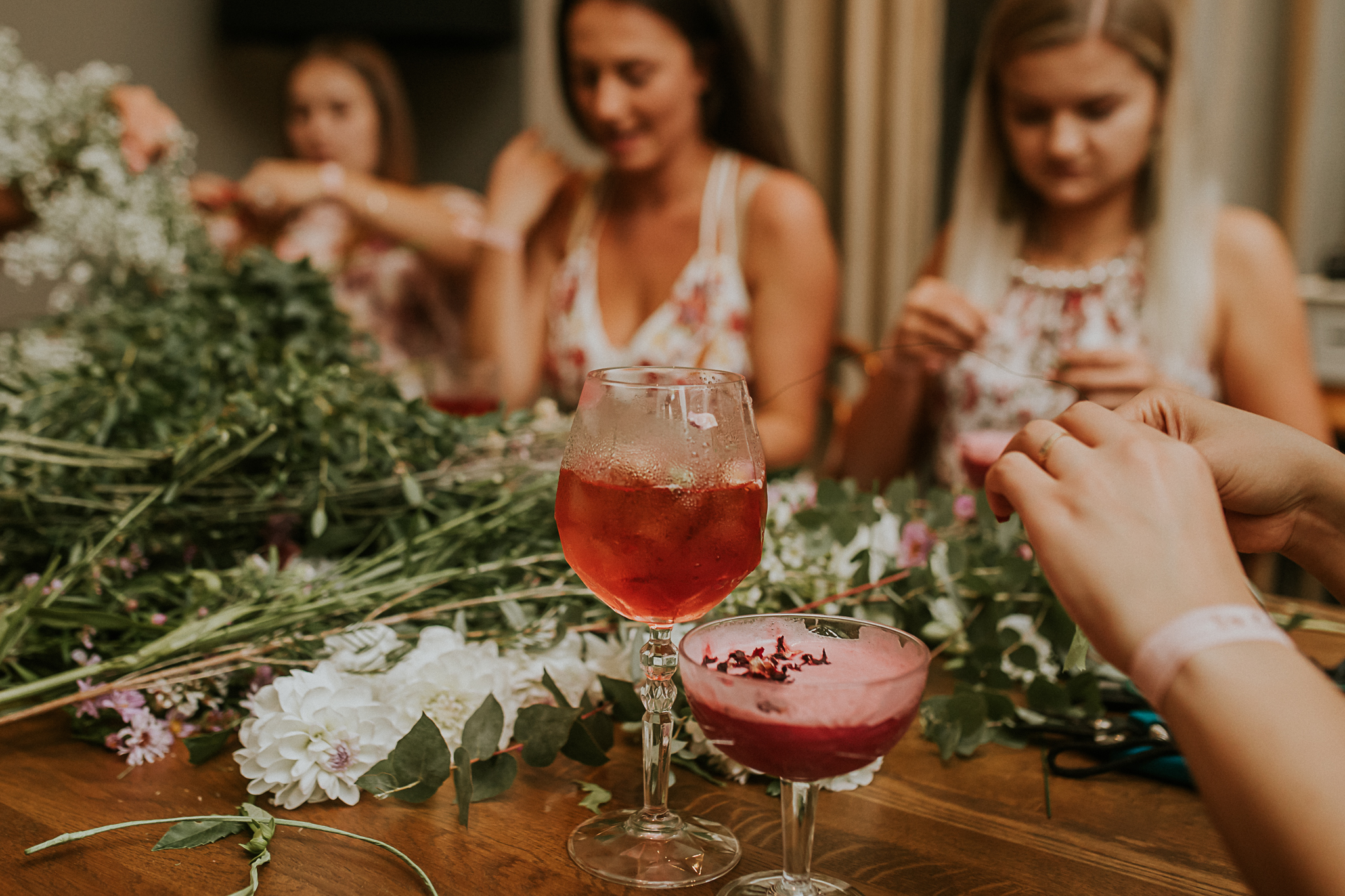 Trendem podczas wieczorów panieńskich czy urodzin stają się teraz kreatywne spotkania ze znajomymi. Podczas takich spotkań nie tylko pije się kawę i zajada się ciastem. Na takie spotkania zaprasza się osobę, która robi ciekawe rzeczy. Dlatego, podczas wieczoru panieńskiego Ani, na który zabiorę Was pod postem, dziewczyny uczyły się jak pleść wianki. Na pozór spotkanie nie różniło się od tych zwyczajnych, przy stole. Wieczór odbył się w restauracji, były drinki, ciasto i dobre jedzenie. Pani Kwiat-kowska uczyła dziewczyny jak zrobić przepiękny boho wianek na głowę. Ja w tym czasie fotografowałam dziewczyny. Fotografowanie grupy osób, to nie lada wyzwanie. Zawsze znajdzie się ktoś, kto właśnie zamknie oczy. Pewien naukowiec podaje, że człowiek mruga średnio 10 razy na minutę. W rezultacie zamknięcie oczu trwa około 250 milisekund. Prędkość migawki to 8 milisekund. Dlatego sprzedam Wam rozwiązanie, zanim zrobisz zdjęcie, każ wszystkim zamknąć oczy. Dobre rezultaty, są niemal pewne.