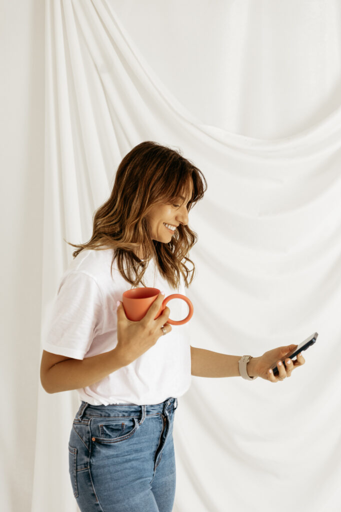 Podczas sesji uchwyciliśmy Anię w trakcie pracy – przy komputerze, ze smartfonem, w momencie prowadzenia konsultacji online. Dzięki temu zdjęcia są naturalne i oddają dynamikę jej codziennej działalności.