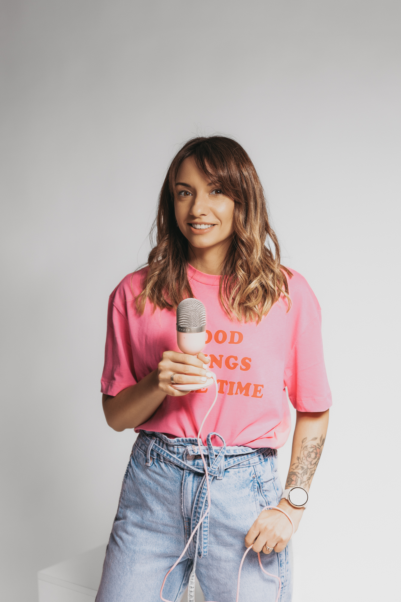 Stylizacje dobraliśmy tak, aby oddawały profesjonalizm, ale jednocześnie podkreślały autentyczność Ani. Ubrania w neutralnych kolorach z akcentami nawiązującymi do jej brandingu pomogły stworzyć spójny wizerunek.