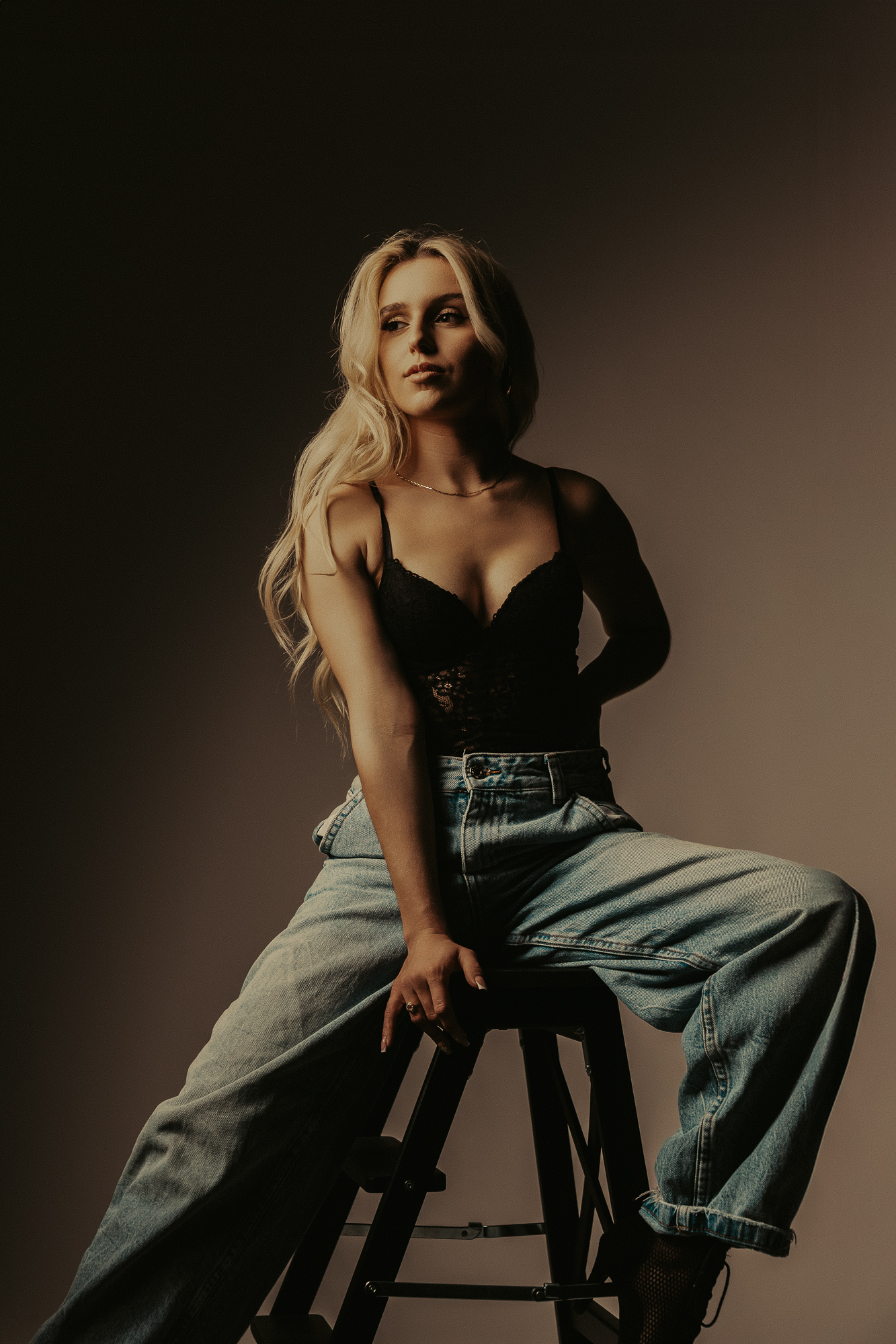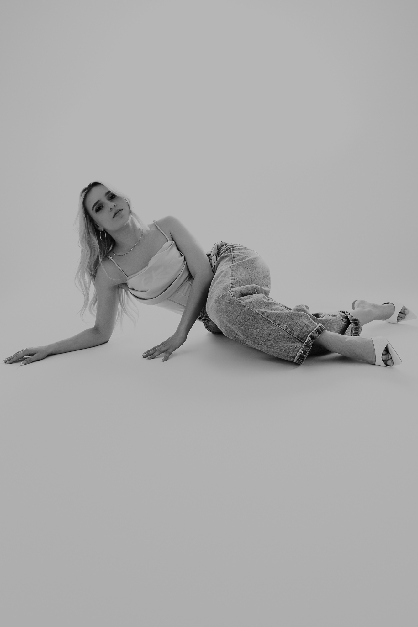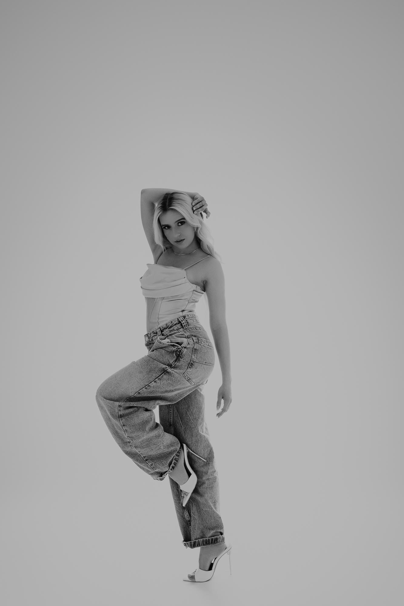 Minimalizmem, który był mocny w wyrazie. Stylizacja: jeansy i biały top. Sceneria: czysta, jasna, skupiona na formie. Kadry powstały niemal same – wystarczyło, że Karolina była sobą. To właśnie w takich sesjach kobiecość pokazuje się najpełniej.