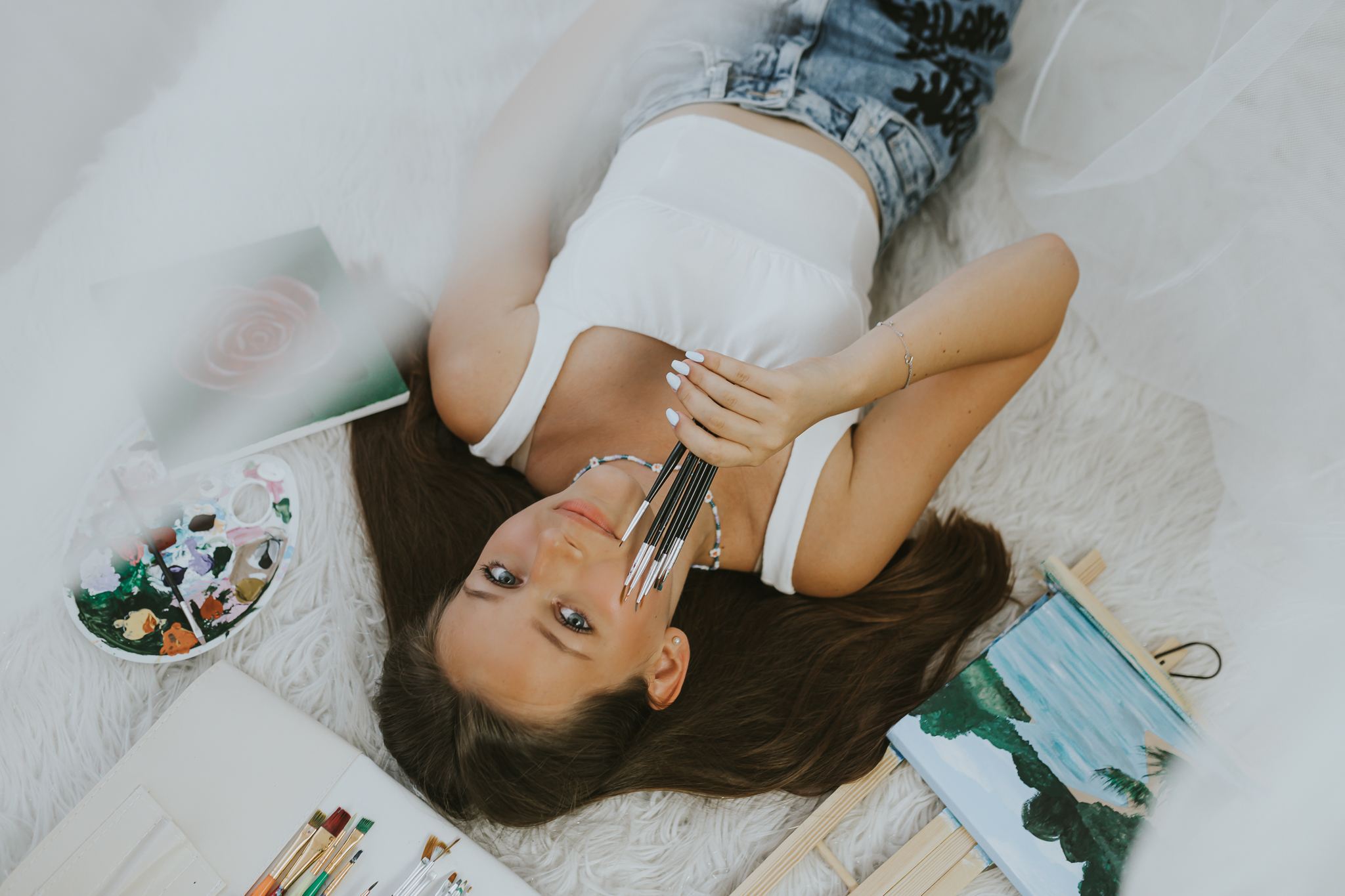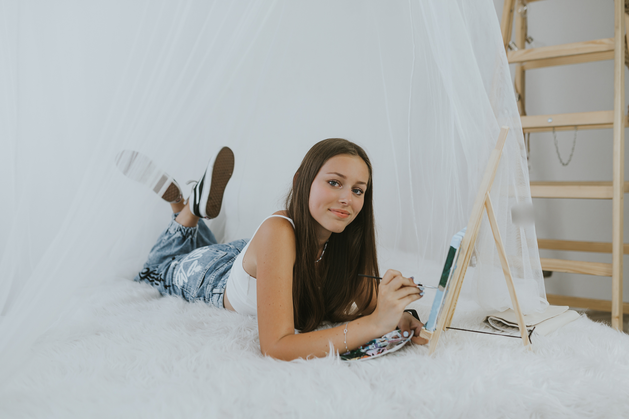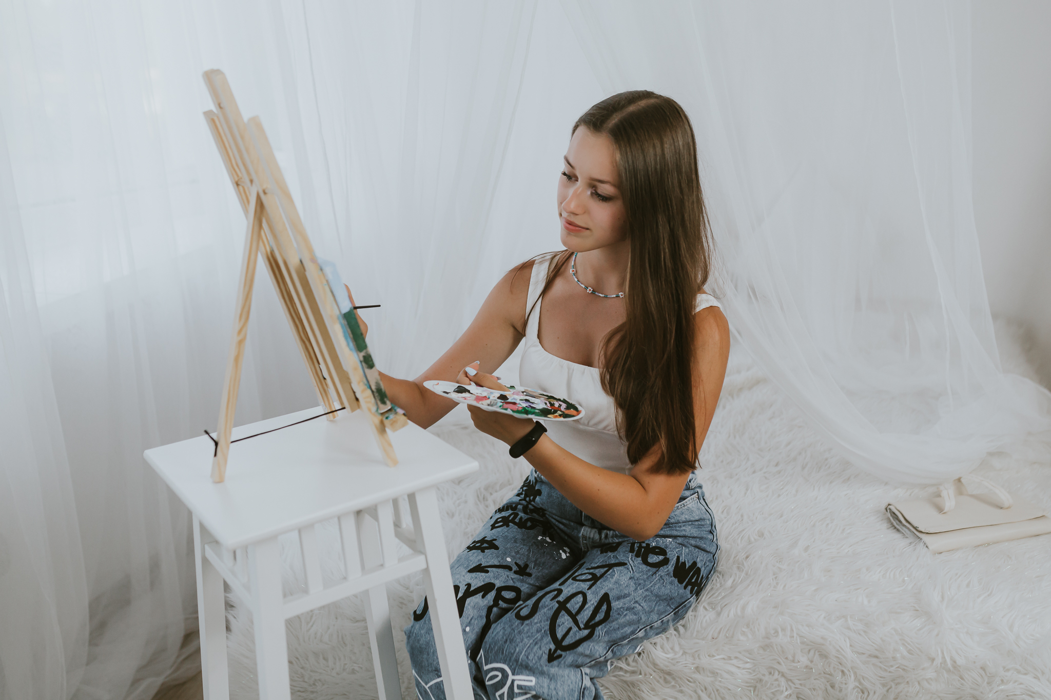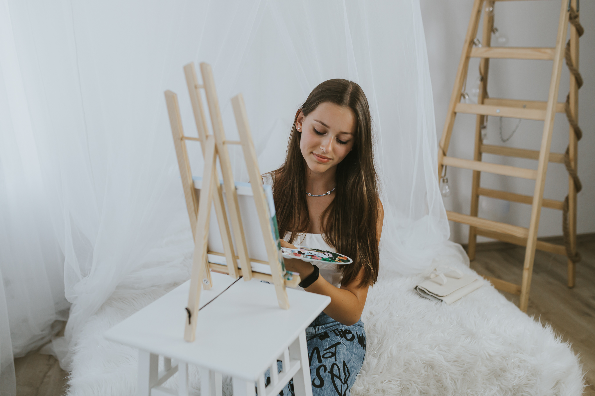 Kinga to delikatna, młoda istota do tego niezwykle utalentowana. Postanowiłyśmy na zdjęciach uwiecznić jej hobby. Kinga przepięknie maluje. Dobrze jest mieć pasję. To pozwala się zrelaksować. Znaleźć chwilę na ucieczkę od codziennych zadań i obowiązków. Moją pasją jest fotografia. Teraz, jest już moim sposobem na życie. Jednak nadal dobrze bawię się poza pracą zarówno za jak i przed aparatem. Tobie Kinga życzę, by Twój talent w przyszłości również pozwolił Ci łączyć pracę z pasją. To jest niezwykłe, kiedy można robić to, co się kocha i jeszcze zarabiać dzięki temu pieniądze. Tego Wam życzę Kochani! Miejcie pasje i spełniajcie marzenia!