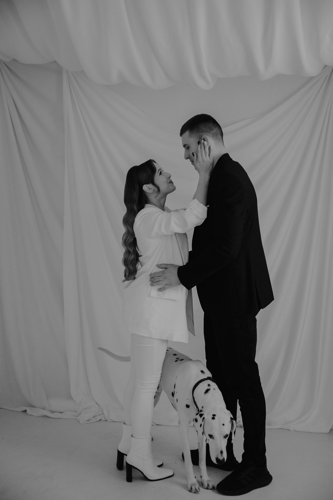 Dodatkowo, w warunkach studyjnych mamy pełną kontrolę nad światłem i tłem – co pozwala w pełni skupić się na emocjach i relacji między fotografowanymi. To idealne rozwiązanie zwłaszcza dla par z psami o silnej osobowości lub tych, które nie czują się pewnie na zewnątrz.